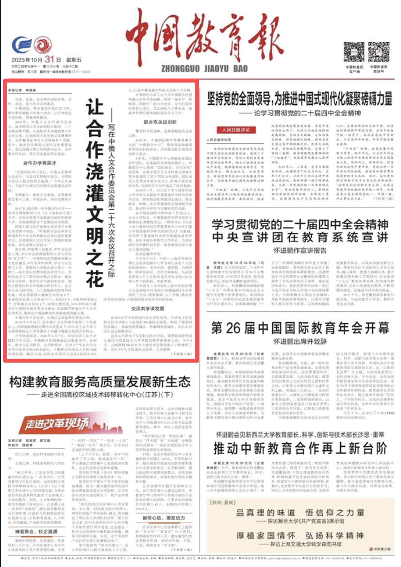 哈工大全媒体(梁英爽/文)10月31日,在中俄人文合作委员会第二十六次会议召开之际,《中国教育报》头版刊发报道《让合作浇灌文明之花——写在中俄人文合作委员会第二十六次会议召开之际》,报道哈工大打造中俄基础学科拔尖创新人才品牌、开展跨国联合培养与科研协同。