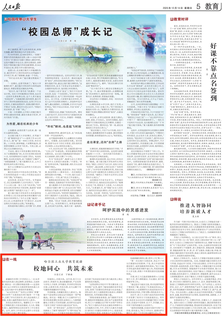 哈工大全媒体(李双余/文)12月14日,《人民日报》推出《哈尔滨工业大学教育援疆 校地同心 共筑未来》,聚焦我校主动担当、积极作为,推动新疆资源、产业优势与学校人才培养、学科建设、科学研究等有效对接,以教育为笔、科技为墨,在天山脚下书写教育援疆的时代答卷。