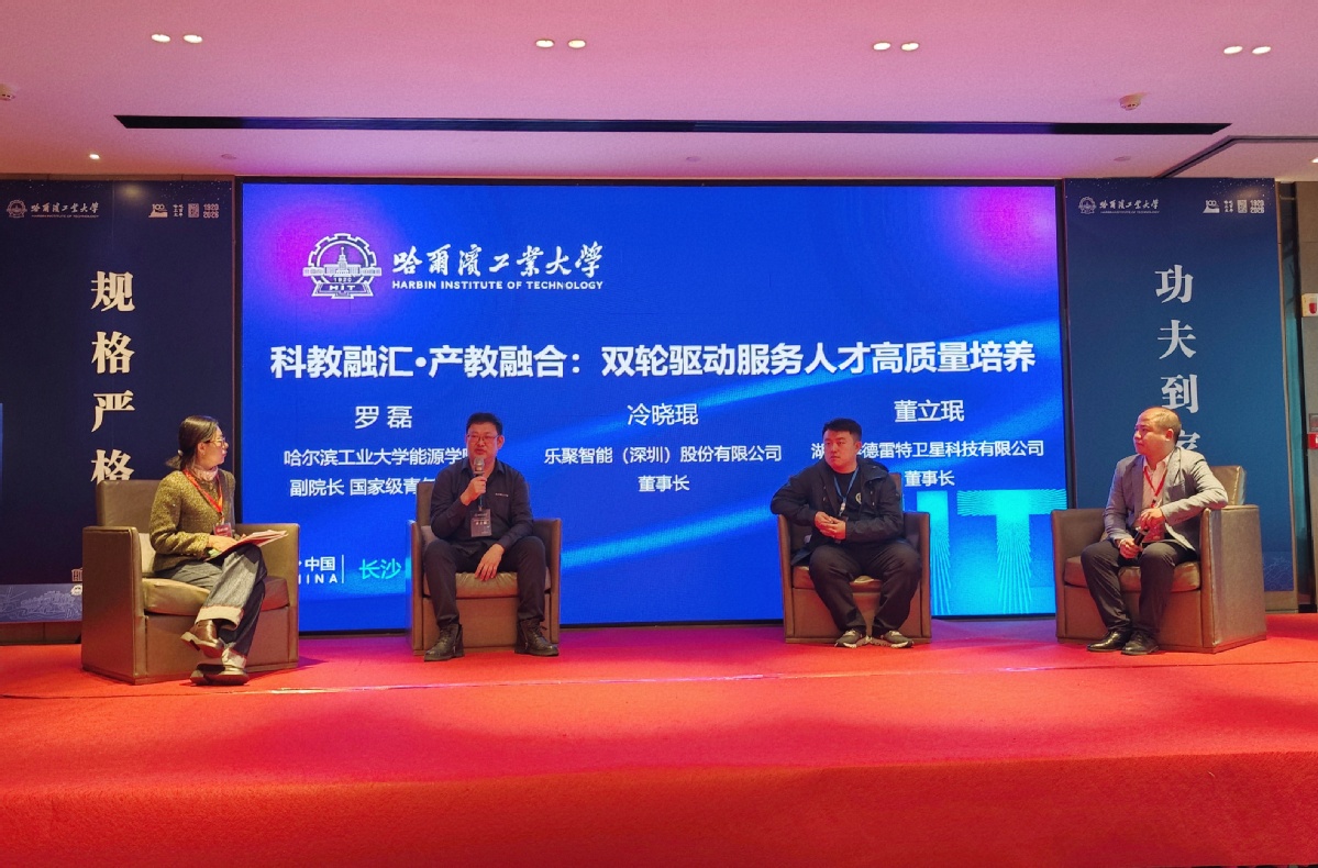 研讨会设置“科教融汇•产教融合:双轮驱动服务人才高质量培养”“科技赋能教育转型 数字化教育实践探索”两场圆桌论坛。能源科学与工程学院罗磊教授、乐聚智能(深圳)股份有限公司董事长冷晓琨、湖南赛德雷特卫星科技有限公司董事长董立珉从高校和企业视角分享了协同育人实践经验。参会的湘、鄂两省重点中学校长及教师代表围绕数字化教学改革、拔尖创新人才早期发现和培养等话题进行深入研讨交流。与会代表还现场观摩了哈工大学子自主研发的无人机、低空飞行器等科技创新成果演示。