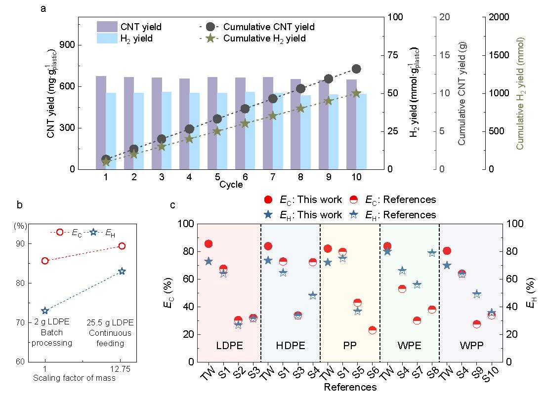 塑料污染是全球性环境挑战,如何将低值废塑料转化为高附加值材料是当前循环经济领域的前沿科学问题。针对传统电加热存在的能量效率低、反应不均匀等共性难题,团队创新性地将电磁感应加热技术与金属多孔催化剂相结合,实现了催化反应过程的精准调控与强化,显著提升了反应体系的传热传质效率,为废塑料化学回收提供了新的技术路径。研究团队深入揭示了不同金属催化剂在催化热解过程中的作用机制,阐明了催化剂界面特性对碳纳米管成核与生长的调控规律,为高性能催化剂的设计提供了理论依据。所制备的碳纳米管在能源存储与热管理等领域展现出广阔的应用前景,进一步的技术经济性分析表明,该工艺具有显著优势,为废塑料资源化利用的产业化发展提供了可行性支撑。