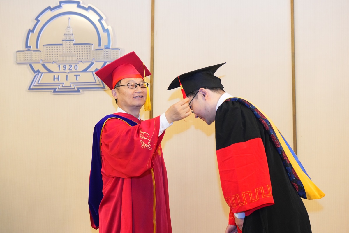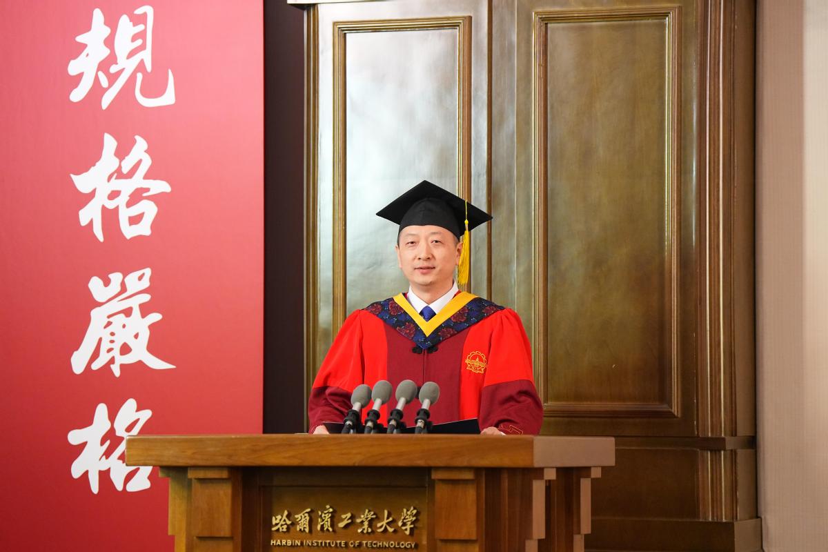 “一所大学的精神,是深刻在师生骨子里的文化基因……同学们,你们是新时代哈工大‘尖兵’文化涵养的优秀代表,奔赴未来必将成为推动强国建设的中坚力量。”机电工程学院赵京东教授作为导师代表寄语毕业生,要厚植底色,以哈工大精神立身致远;守正创新,以实干笃行成就远大事业;涵养智慧,以从容之心绘就圆满人生。