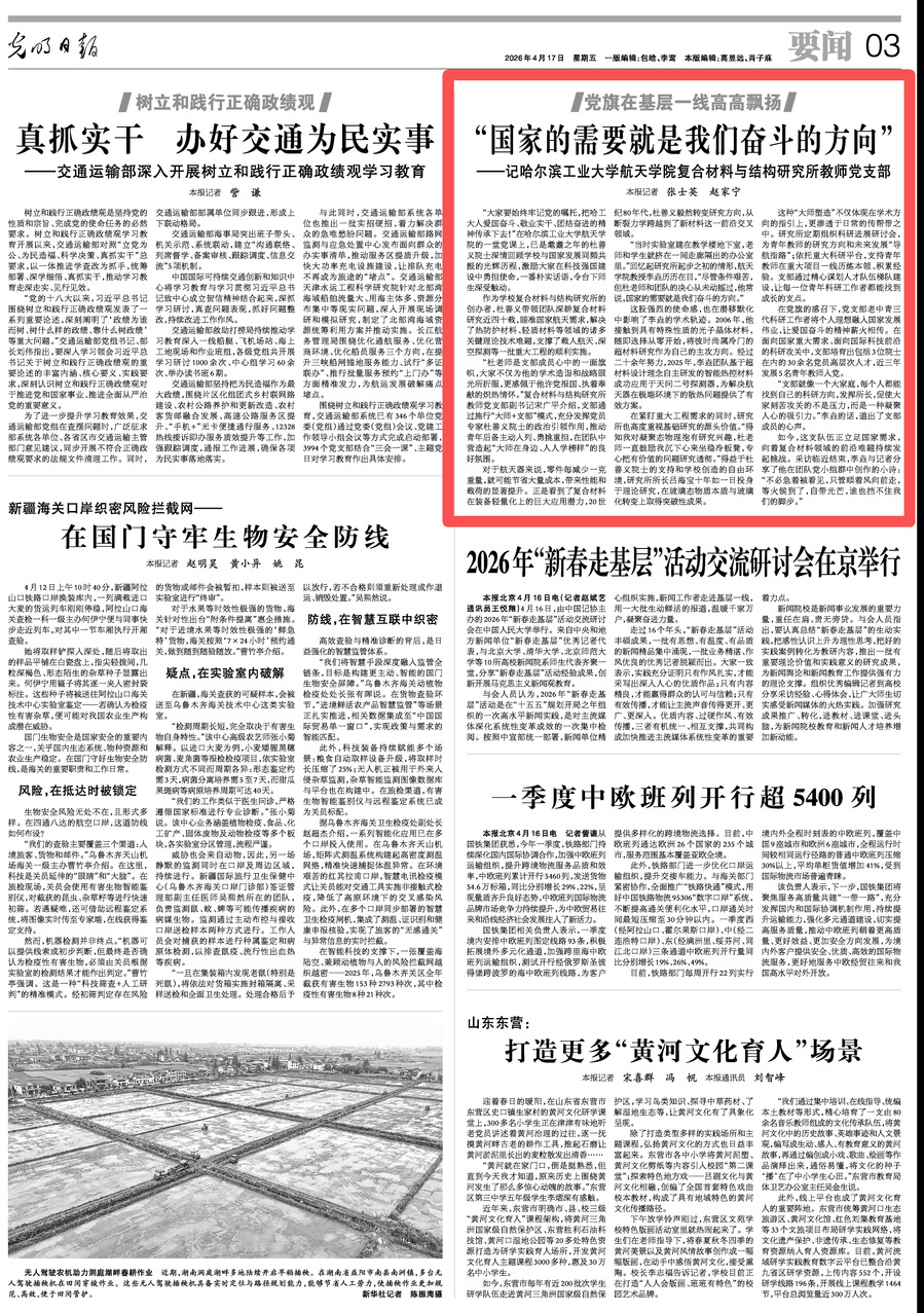 哈工大全媒体(李双余/文)4月17日,《光明日报》“党旗在基层一线高高飘扬”专栏刊发《“国家的需要就是我们奋斗的方向”——记哈尔滨工业大学航天学院复合材料与结构研究所教师党支部》,报道我校航天学院复合材料与结构研究所教师党支部将国家需要作为奋斗方向,通过施行“大师+支部”模式,充分发挥党员专家杜善义院士的政治引领作用,在团队中营造起“大师在身边、人人学榜样”的良好氛围,党支部老中青三代科研工作者将个人理想融入国家发展伟业,让爱国奋斗的精神薪火相传。